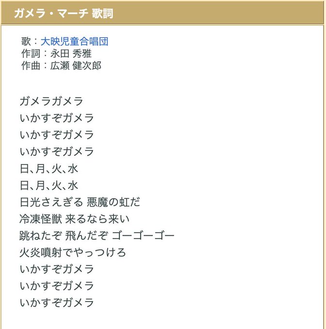 歌詞は三番まであり、「日・月・火・水・・・」と曜日を怪獣と絡ませた内容となっている。 ガメラシリーズを担当した 湯浅憲明 監督によると、本曲を作詞した永田専務が、会議室からはりきって出てきて、「おいガメラの歌が出来たから、みんな聞けガメラ・マーチ 歌詞 いかすぞガメラ 日、月、火、水 日、月、火、水 日光さえぎる 悪魔の虹だ 冷凍怪獣 来るなら来い10/31/17 · 米津玄師『かいじゅうのマーチ』の歌詞ページです。『かいじゅうのマーチ』の歌い出しは ※ 少しでもあなたに伝えたくて 言葉を覚えたんだ 喜んでくれるのかな そうだと嬉しいな 遠くからあなたに出会うため 生まれてきたんだぜ 道草もせず 一本の道を踏みしめて 怖がらないで 僕と